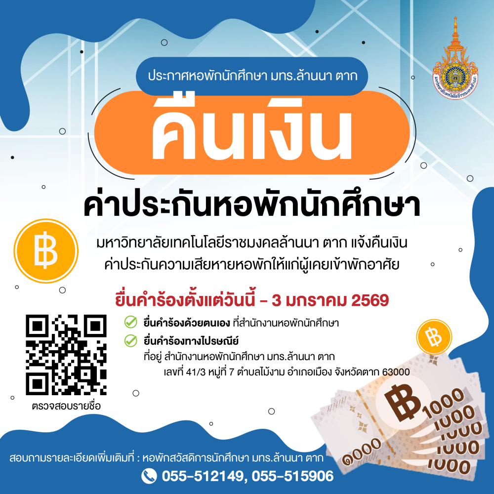 อาศัยอำนาจตามความในคำสั่งมหาวิทยาลัยเทคโนโลยีราชมงคลล้านนา ที่ 1748/2568 ลงวันที่ 7 ตุลาคม 2568 เรื่อง การจ้างและแต่งตั้งบุคคลให้ดำรงตำแหน่งพนักงานในสถาบันอุดมศึกษา ตำแหน่งประเภทผู้บริหาร ตำแหน่งผู้อำนวยการสำนักงานบริหารมหาวิทยาลัยเทคโนโลยีราชมงคลล้านนา ตาก และคำสั่งมหาวิทยาลัยเทคโนโลยีราชมงคลล้านนา ที่ 1586/2568 ลงวันที่ 19 สิงหาคม 2568 เรื่อง มอบอำนาจให้ผู้อำนวยการสำนักงานบริหารมหาวิทยาลัยเทคโนโลยีราชมงคลล้านนาปฏิบัติราชการแทนอธิการบดี จึงประกาศแจ้งผู้ที่เคยเข้าพักอาศัยในหอพักนักศึกษามหาวิทยาลัยเทคโนโลยีราชมงคลล้านนา ตาก จำนวน 1,355 คน ตามรายชื่อแนบท้ายประกาศนี้ ติดต่อขอคืนเงินค่าประกันความเสียหายหอพักนักศึกษาภายใน 60 วัน นักจากวันที่ประกาศ โดยสามารถยื่นแบบคำร้องได้ที่ สำนักงานหอพักนักศึกษา มทร.ล้านนา ตาก เลขที่ 41/3 หมู่ที่ 7 ถนนหพลโยธิน ตำบลไม้งาม อำเภอเมืองตาก จังหวัดตาก 63000 หมายเลขโทรศัพท์ 0 5551 2149, 0 5551 5906 ในวันและเวลาราชการ