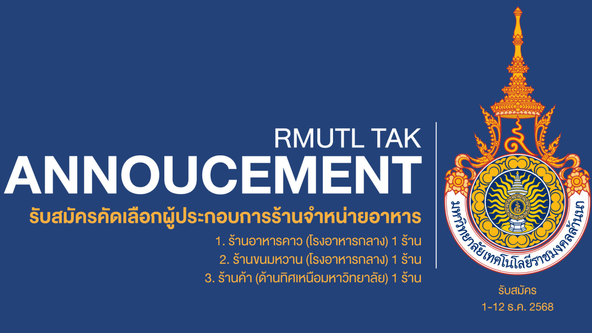 มหาวิทยาลัยเทคโนโลยีราชมงคลล้านนา ตาก มีความประสงค์จะรับสมัครคัดเลือกผู้จำหน่ายอาหาร เพื่อจัดจำหน่ายให้กับบุคลากรและนักศึกษามหาวิทยาลัยเทคโนโลยีราชมงคลล้านนา ตาก โดยกำหนดให้มีการจัดจำหน่ายในราคาที่เป็นธรรม มีความสะอาด ถูกสุขลักษณะ และเป็นไปตามระเบียบกฎเกณฑ์ของทางราชการและมหาวิทยาลัย
