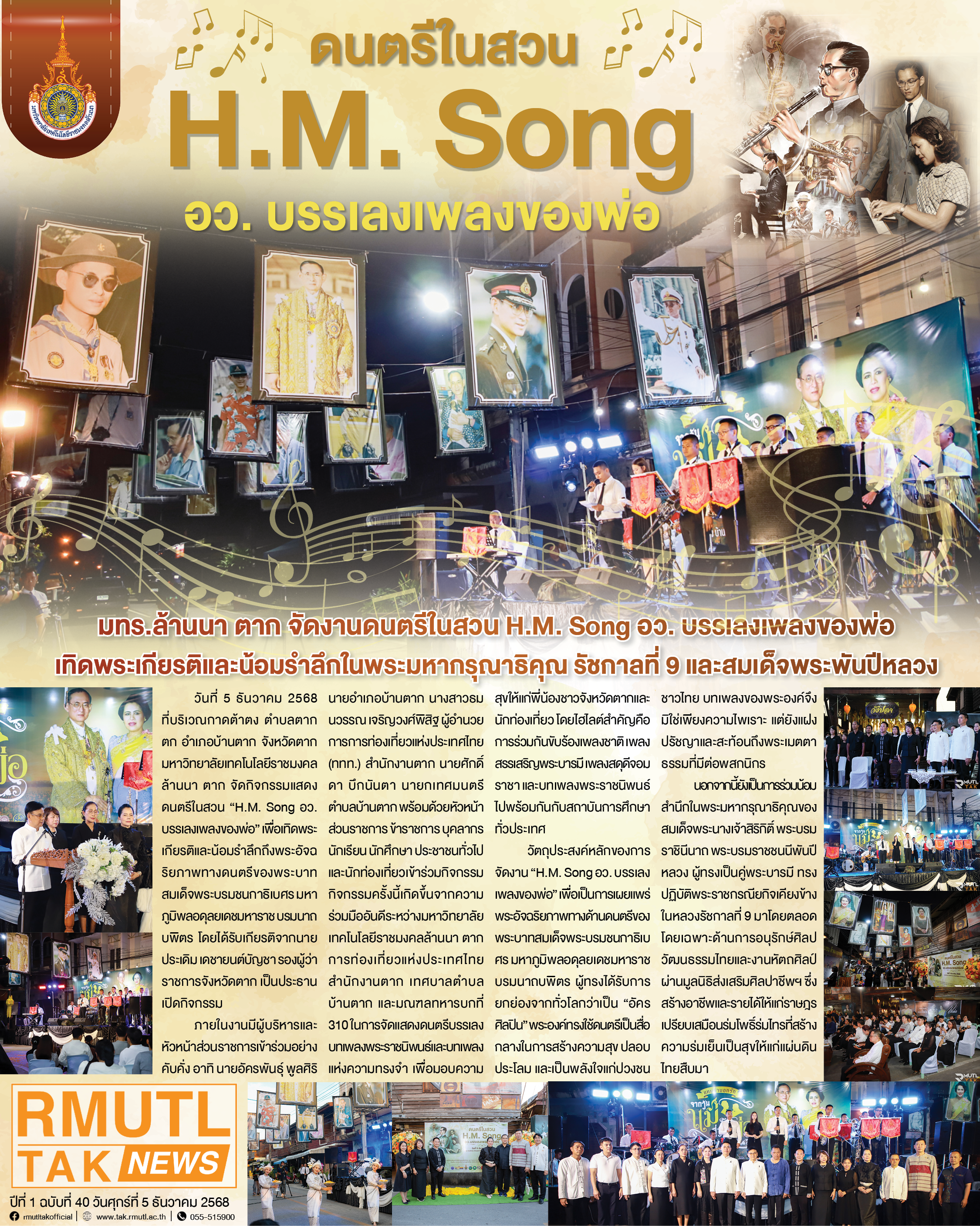 วันนี้ (5 ธ.ค. 68) เวลา 18.00 น. ที่บริเวณกาดต้าตง ตำบลตากตก อำเภอบ้านตาก จังหวัดตาก มหาวิทยาลัยเทคโนโลยีราชมงคลล้านนา ตาก จัดกิจกรรมแสดงดนตรีในสวน "H.M. Song อว. บรรเลงเพลงของพ่อ" เพื่อเทิดพระเกียรติและน้อมรำลึกถึงพระอัจฉริยภาพทางดนตรีของพระบาทสมเด็จพระบรมชนกาธิเบศร มหาภูมิพลอดุลยเดชมหาราช บรมนาถบพิตร โดยได้รับเกียรติจากนายประเดิม เดชายนต์บัญชา รองผู้ว่าราชการจังหวัดตาก เป็นประธานในพิธีเปิด